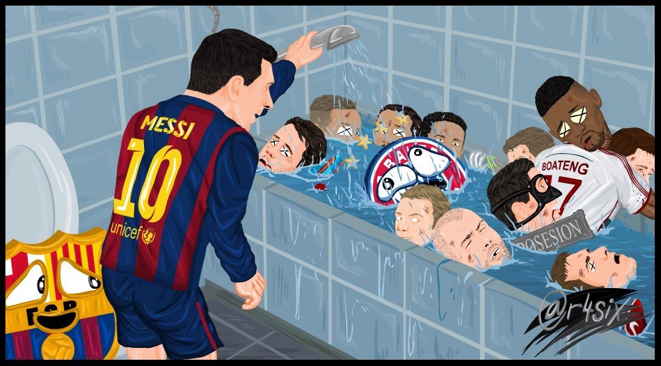 Интересно, ты вообще матч смотрел? Какие 1:1 ? Первый тайм - Бавария вообще ничерта не показала. В начале второго, в течении 15 минут, они пытались но не вышло. Потом, естественно переломил ход игры Месси, но тут без вариантов было. Заслуга Месии в победе Барселоны велика, но не стоит забывать что у Баварии основной костяк команды в лазарете + пара калек на поле ( я про Левандовского). Так что о каких 1:1 вообще идет речь? Счет отобразил полное соответсвие того, что было на поле. Ах да, еще забыл сказать что вообще-то Бавария еще легко обделалась отделалась благодаря индивидуальным способностям Нойера. Если бы не его талант, то счет как минимум перевалил бы за 5 мячей.