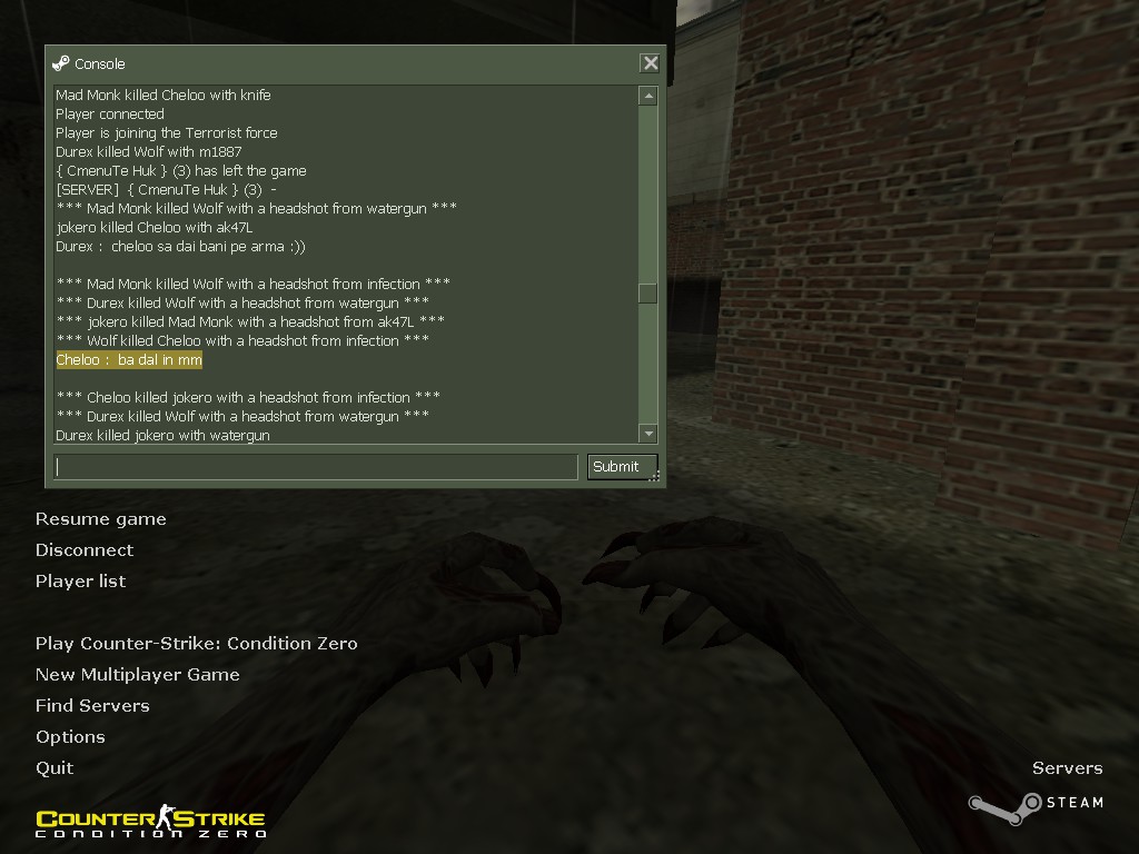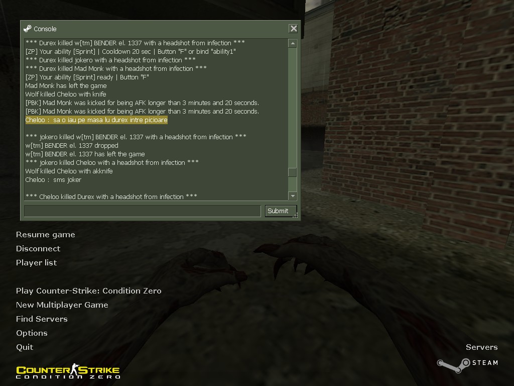 2013-10-03 01:18:52 | STEAM_0:0:1896075581 | Human | Geroin))) 31RUS : voo6we -)to podstava bila bi esli 9 zarazil 6i ego
