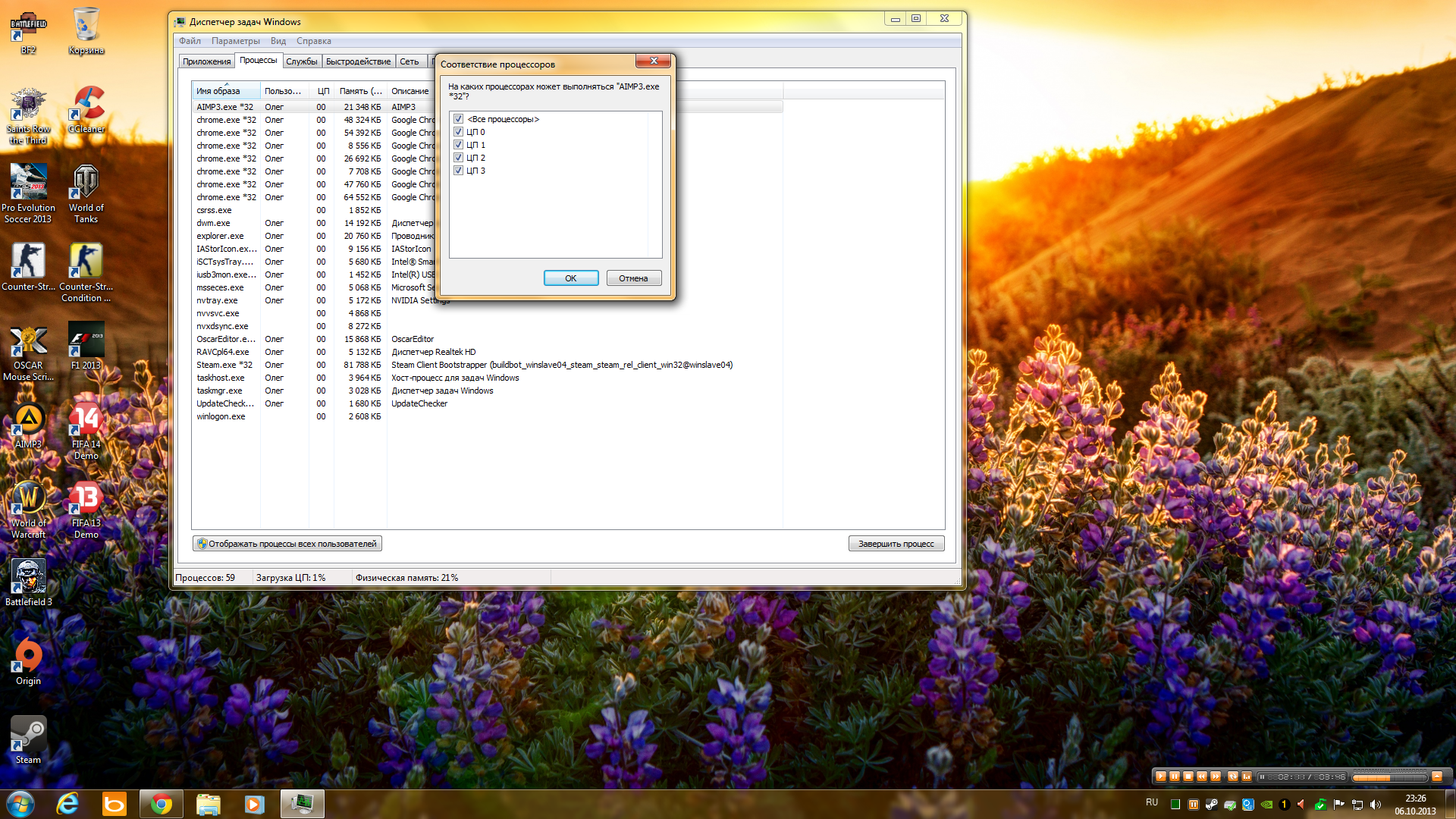 Molniy57 писал(а):3). В диспетчере задач найди hl.exe. и кликни правой кнопкой мышки по нему( hl.exe ), далее установи низкий приоритет для КС( Приоритет --> Низкий ), потом задай соответствие на ЦП 2 и ЦП 3, а с ЦП 0 и ЦП 1 галочки сними.