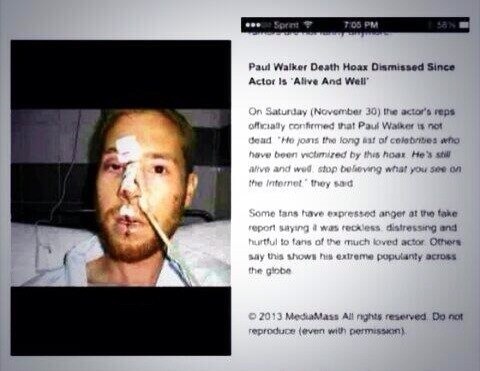 Несколько минут назад стало известно, что останков известного актера Пола Уокера в машине не было, это доказывает экспертиза, проведенная сегодня. В данный момент очевидно, что Пол скрывается, и никто, даже его семья, не знает об его местоположении. Единственное, что удалось установить, это тот факт, что страну актер не покидал."; - сообщил источник, приближенный к актеру.и ещё, авария произошла в 3:30, а жена Пола в твиттере написала в 3:05, про смерть своего мужа, наиграно, “Приблизительно в 11:00. И в пятницу (29 ноября 2013), наш любимый актер Пол Уокер скрылся. Пол Уокер родился 12 сентября 1973 в Глендейле. Его будут скучать, но не забывать. Пожалуйста, покажите свое сочувствие и соболезнования, комментируя и любя эту страницу”. Сотни поклонников немедленно начали писать свои выражения сочувствия на странице Facebook, выражая их печаль, что талантливый 40-летний актер был мертв. (Так писали многим людям агенты, чтобы было реалистично. так что на 95% Пол жив.
