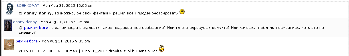 Спасибо за реакцию. Я все прекрасно понимаю, насчет форума. Это не относилось к жалобе, скорее для заострения внимания и для самого режима, может хоть в такой форме до него дойдет что так делать нельзя, что нужно соблюдать рамки приличия и уважать каждого на этом проекте.
